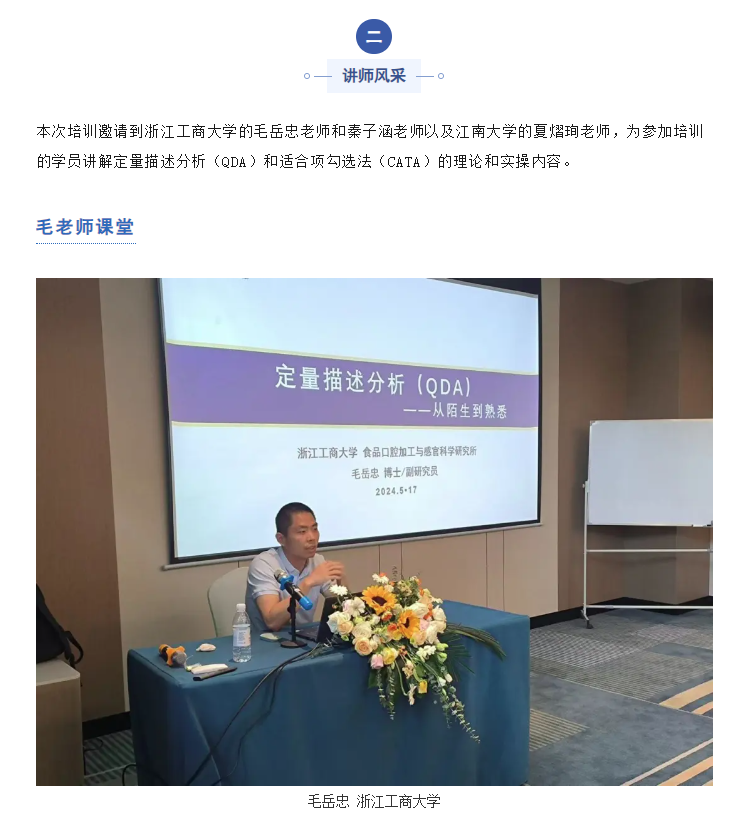2024年5月17-18日,由食品伙伴網主辦的SEPA 感官分析QDA/CATA 實操培訓班在杭州萬信瑞鉑酒店圓滿結束!來自豐益、貴州習酒、雅培、伊利伊諾科技等多家企事業單位學員參加了此次培訓。