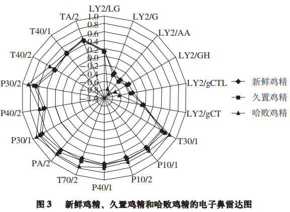 分別將新鮮雞精、久置雞精和哈敗雞精的電子鼻數據作雷達圖,對比結果如圖3所示。3 種雞精樣品被明顯地區分開來。哈敗雞精的風味輪廓明顯與新鮮雞精、久置雞精不同,傳感器T40/2、P30/2、P40/2、P30/1、PA/2、T70/2、P40/1、P10/2、P10/1、T30/1的響應值明顯大于新鮮雞精、久置雞精;傳感器LY2/gCTL、LY2/GH、LY2/AA、LY2/G的響應值由于是負值,哈敗雞精的響應信號則明顯低于新鮮雞精、久置雞精,說明哈敗雞精的響應值信號與新鮮雞精、久置雞精有較大差異,電子鼻分析得到新鮮雞精和久置雞精的風味輪廓更為接近,并與哈敗雞精有較大不同。