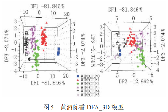 由圖 5 看出, 陳香分值沿圖 5 左圖中所示箭頭方向遞增,其中 DF1 占 81.8 % 、DF3 占 2.1 %。從圖 5 中左圖可以看到,在 DF1 方向上,陳香分值為 4 分和 5 分的樣品差異不明顯,其余分值差異較明顯,這說明在陳香分值為 0~4 分的酒樣中,DF1 占最主要因素;而在圖 5 中右圖所示陳香分值為 4 分和 5 分的酒樣差異較明顯, 這說明 DF2 和 DF3 在陳香分值為 4~5 分的酒樣區分中占主要因素,圖 5 中 DF2 占 13.0 %。