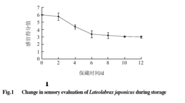 如上圖,保藏初期鱸魚新鮮無(wú)異味、鰓絲鮮紅清晰、體色鮮艷有光澤,肌肉僵硬良好;第4天鱸魚眼角膜稍有混濁,鰓色部分變暗紅,魚體開始變軟,與前2d相比質(zhì)量下降明顯,感官的分值為4.4;第6天眼球平坦,眼角膜較渾濁,鰓大部分變暗紅色,略有腥臭味,魚體色澤較暗,肌肉彈性較差,第8天鰓全部變?yōu)榘导t色且有黏液,魚體無(wú)光澤,鱗片無(wú)脫落。感官的分值為3.2;第10天魚體腥臭味變大,肌肉變軟,手指按壓后彈性不易消失;第12天眼球平坦,鰓色變褐,腥臭味大,感官得分值為3.0。