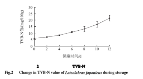 由上圖可知,保藏前4d TVB-N值上升比較緩慢,第4天開始上升加速,說(shuō)明鱸魚品質(zhì)從第4天開始下滑較快;而由圖一感官得分的變化可知,從第2天開始鱸魚感官品質(zhì)明顯下降,說(shuō)明在保藏初期鱸魚感官變化比TVB-N的變化更靈敏。第12天鱸魚的TVB-N值為21.6mg/100g,整個(gè)保藏過(guò)程中TVB-N值均為超過(guò)GB/T 18108-2008三級(jí)標(biāo)準(zhǔn)的要求(小于30mg/100g)。
