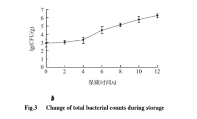 圖三表明,保藏出去菌落總數(shù)變化較小,出現(xiàn)明顯的延滯期,這是由于鱸魚中的微生物剛進(jìn)入冷環(huán)境,在0℃條件下生長(zhǎng)緩慢。第6天菌落總數(shù)較第4天顯著增長(zhǎng),保藏后期總數(shù)繼續(xù)遞增,在貨架期終點(diǎn)時(shí)最大。菌落總數(shù)的變化趨勢(shì)與TVB-N值檢測(cè)結(jié)果基本一致。