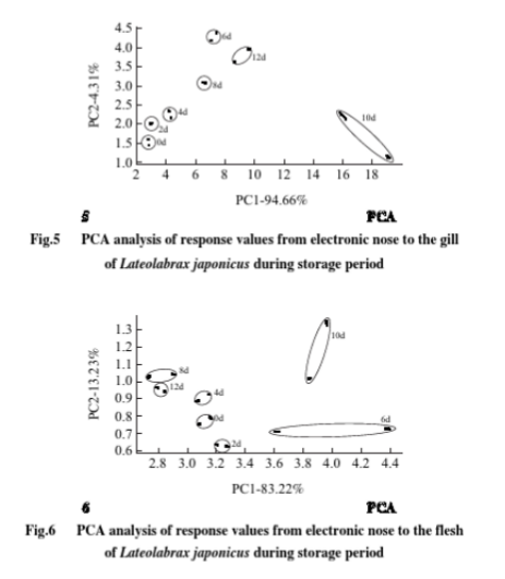 生鮮水產(chǎn)品在低溫保藏及流通過(guò)程中會(huì)受到溫度、微生物以及酶等因素的作用而導(dǎo)致品質(zhì)下降,并伴有揮發(fā)行氣味物質(zhì)的變化。本文用電子鼻檢測(cè)鱸魚魚鰓及魚肉的氣味變化,運(yùn)用主成分分析(PCA)、線性判別分析和負(fù)荷加載分析對(duì)數(shù)據(jù)進(jìn)行處理,并結(jié)合感官評(píng)定、揮發(fā)性鹽基氮和菌落總數(shù)進(jìn)行分析,為鱸魚新鮮度的快速檢測(cè)提供一種新的方法。