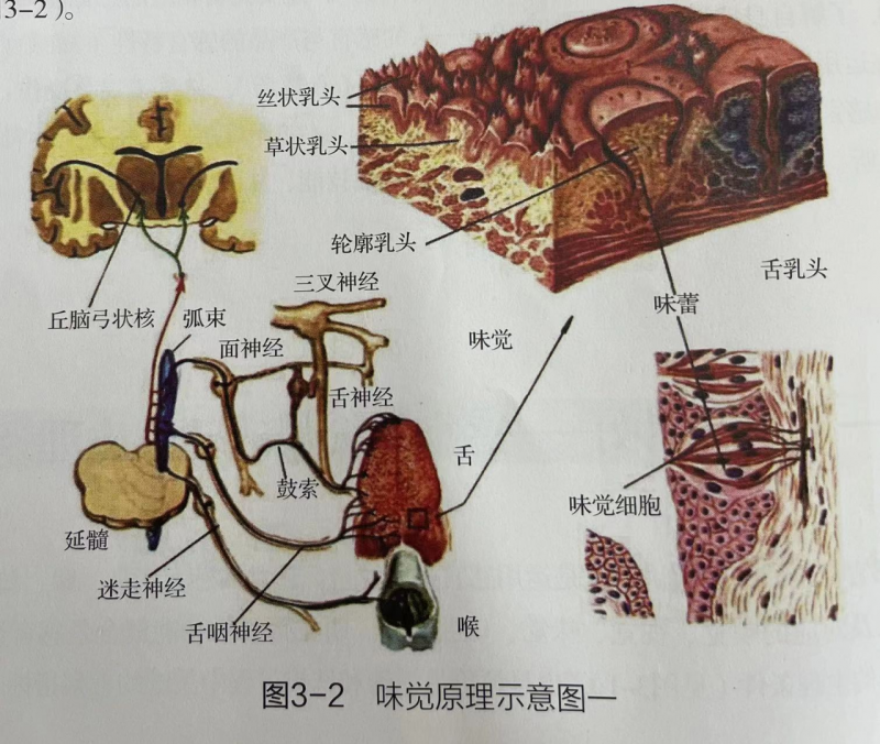 可溶性呈味物質進入口腔后,在舌肌作用下與味蕾接觸,刺激味蕾中的味細胞產生神經沖動,以脈沖的形式通過神經系統傳至大腦皮層味覺中樞后產生味覺(圖3-2)。