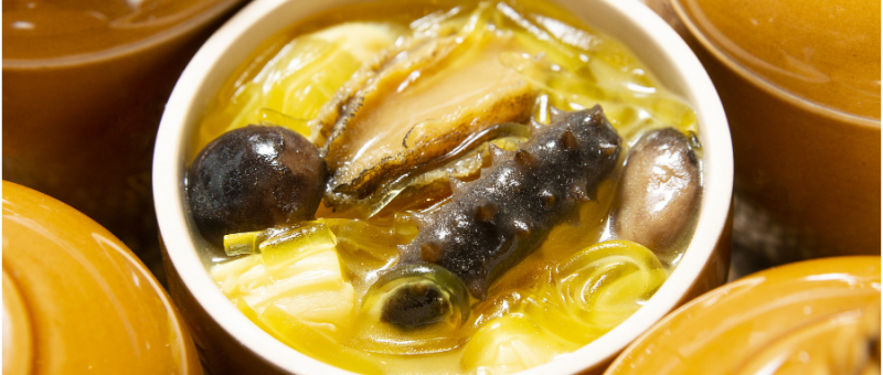“佛跳墻”是傳統(tǒng)閩式菜肴的特色名菜之首,通常以鮑魚、海參、甲魚裙、魚膠、杏鮑菇、蹄筋、花菇、瑤柱和鴿子蛋等為原料,加入熬制好的高湯后文火煨制而成。“佛跳墻”因營養(yǎng)價(jià)值豐富、風(fēng)味鮮美濃郁而廣受人們青睞。