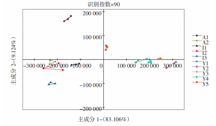對10種辣木籽電子鼻數據進行DFA結果分析,見圖5。由圖5可知,I1、I2和I3分布在DF1正半軸,A1與A2分布在第二象限內,Y1、Y2、Y3、Y4和Y5則分布在第三象限內,說明同一品種辣木籽的氣味相近,不同品種之間氣味上有較大差異。3個品種辣木籽響應值分布在不同區域內且無重疊,因此可用于判別不同品種辣木籽,與色譜圖分析一致。
