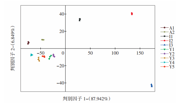 DFA結果分析對10種辣木籽電子鼻數據進行DFA結果分析,見圖5。由圖5可知,I1、I2和I3分布在DF1正半軸,A1與A2分布在第二象限內,Y1、Y2、Y3、Y4和Y5則分布在第三象限內,說明同一品種辣木籽的氣味相近,不同品種之間氣味上有較大差異。3個品種辣木籽響應值分布在不同區域內且無重疊,因此可用于判別不同品種辣木籽,與色譜圖分析一致。