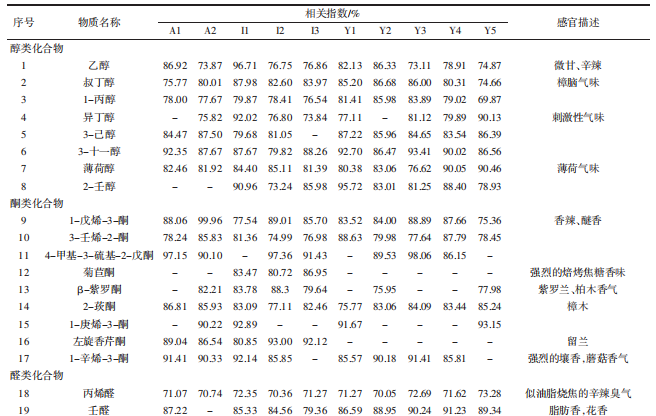 表2 10種辣木籽的氣味成分、相關指數及感官描述