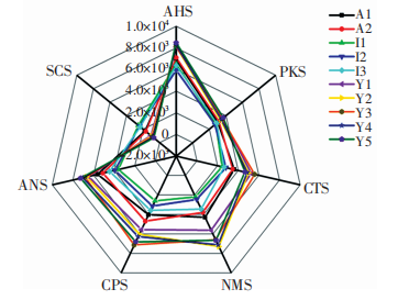 每種辣木籽樣品做3次平行試驗,計算味覺傳感器響應強度的平均值,得到雷達圖見圖6。由圖6可知,I1、I2和I3,A1和A2,Y1、Y2、Y3、Y4和Y5辣木籽樣品的各傳感器響應強度數值接近,表明同一品種辣木籽的滋味相似;同時,傳感器AHS、CTS、NMS、CPS、ANS和SCS對不同品種辣木籽樣品的響應值離散程度較大,說明這6種傳感器能較好區分不同品種辣木籽。