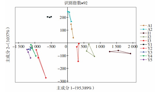 10種辣木籽電子舌PCA結果見圖7。由圖7可知,識別指數為92,說明電子舌對10種辣木籽滋味有良好區分度;主成分1貢獻率95.389%,主成分2貢獻率3.037%,累積貢獻率為98.426%,說明2種主成分可以反映出辣木籽整體滋味。中國云南改良品種的Y1、Y2、Y3、Y4、Y5分布于DF1負半軸,非洲品種的A1、A2集中在第一象限,印度傳統品種的I1、I2、I3集中于第四象限,說明不同品種辣木籽的滋味有很大差異,而同一品種間滋味相近,與雷達圖分析結果一致。