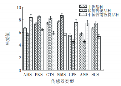 味覺分析3個品種辣木籽的味覺分析結果見圖9。由圖9可知,中國云南改良品種辣木籽有明顯酸甜滋味,可能與其中酯類成分較多有關;印度傳統品種辣木籽具有苦咸鮮口感,可能是由于辣木籽中含有較多刺激性成分;非洲品種辣木籽各傳感器味覺值適中,滋味更為豐富,電子舌的味覺分析進一步印證了電子鼻的風味成分檢測結果。