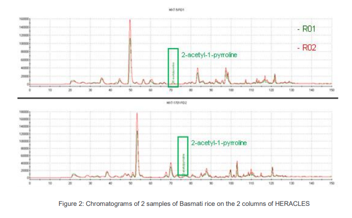 比較其己醛的含量可知大米的氧化水平,比較2-乙酰基-1-吡咯啉含量可知其特征香味在大米中的含量。
