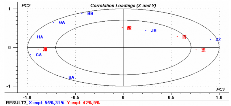 為了進一步確認感官分析結果與電子舌數據的相關性,對兩者進行PLSR分析, 7個不同的傳感器(ZA、BB、BA、GA、HA、JB、CA)作為X變量,感官屬性(酸、甜、苦、澀)作為Y變量,如 圖 4 所示。該 PLSR 模型的方差貢獻率為PC1=55%,PC2=42%。圖4是感官屬性與傳感器的相關性載荷圖,圖中的兩個橢圓,分別表示50%和100%的方差貢獻率。傳感器ZA、BB、BA、GA、HA、CA和感官屬性澀、和甜味位于兩個橢圓之間,說明該模型可以對這些變量具有更好的解釋能力。由圖4可知,傳感器ZZ與澀、苦味的相關性較好,傳感器JB與酸味相關性較強,而傳感器HA、CA與甜味的相關性較好。此相關性結果與圖3 PCA的相關性結果相符合。