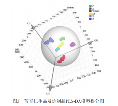 根據(jù)PCA模型分類結(jié)果,按照不同炮制方法將樣品分為6類,建立PLS-DA模型。在PLS-DA模型中,前7個(gè)主成分R2X(cum)為99.4%,R2Y(cum)為97.9%,Q2(cum)為97.1%,說(shuō)明所建立的模型性能良好。如圖3所示,PLS-DA模型得分圖顯示生品和5種炮制品各自聚為一類,表明不同炮制方法可顯著影響苦杏仁的揮發(fā)性成分。