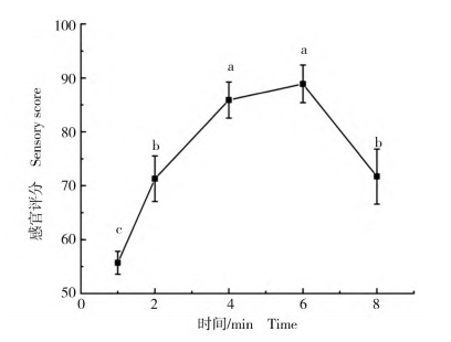 以色澤、氣味、滋味、口感為指標對不同蒸制時間下的脊尾白蝦進行感官評價。在蒸制的前4min,脊尾白蝦的綜合評分呈直線上升,4~6min變化不顯著(P>0.05);當蒸制時間為6min時,綜合感官評分最高;在蒸制8min時蝦體色澤暗淡,蝦體有所損壞,綜合評分下降(圖2)。