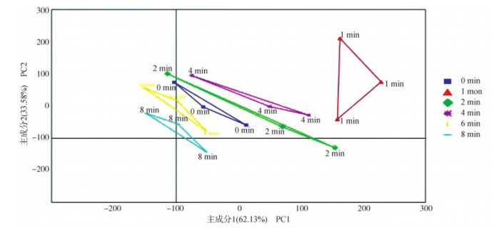 圖4脊尾白蝦不同蒸制時間的主成分分析