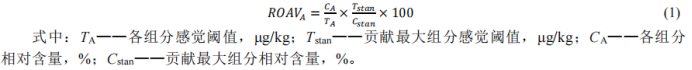 抓飯,市售;Asrree Ⅱ/LS16電子舌、HERACLES Ⅱ電子鼻,氣質(zhì)聯(lián)用儀。 樣品粉碎,稱取1g樣品于20g樣品瓶中,迅速用專用瓶蓋壓蓋密封,電子鼻測定參數(shù):清洗時(shí)間120s,樣品準(zhǔn)備時(shí)間10s,測定時(shí)間120s,載氣流速150mL/min,每組樣品測定5次,取最后3次穩(wěn)定數(shù)據(jù)進(jìn)行分析。 稱取7.5g樣品定容至120mL,振蕩混勻,常溫振蕩孵育30min,4000r/min離心15min,上清液過濾后上機(jī)測定。數(shù)據(jù)采集前,對(duì)電子舌進(jìn)行傳感器活化、校準(zhǔn)等操作,確保檢測數(shù)據(jù)的可靠性與穩(wěn)定性。將100mL濾液置于電子舌專用容器中,樣品采集與清洗交替進(jìn)行每兩個(gè)樣品間放1杯100mL的蒸餾水,清洗10s,樣品采集時(shí)間120s,重復(fù)7次,取后4次試驗(yàn)數(shù)據(jù)。 采用頂空固相微萃取法進(jìn)行樣品處理,稱取2g樣品,放入20mL帶有硅膠墊帽的頂空萃取瓶中,立即密封,萃取溫度60℃,平衡15min,頂空吸附45min。250℃解析5min。 利用ROAV定義對(duì)樣品風(fēng)味貢獻(xiàn)最大的揮發(fā)性風(fēng)味物質(zhì),即ROAVmax=100,其它揮發(fā)性成分ROAV按式(1)計(jì)算。