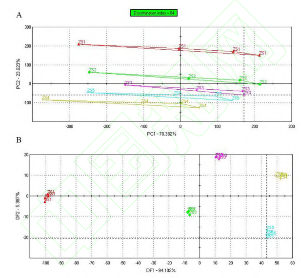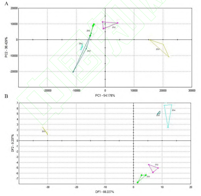 5種抓飯電子鼻檢測主成分分析PCA結(jié)果如圖1所示,第1主成分區(qū)分貢獻(xiàn)率為54.178%,第2主成分區(qū)分貢獻(xiàn)率為38.429%,2個(gè)主成分累計(jì)貢獻(xiàn)率92.607%,總貢獻(xiàn)率超過85%表明試驗(yàn)方法的可行性,說明PC1和PC2兩軸包含了PCA轉(zhuǎn)換中絕大部分的貢獻(xiàn)率,主要成分可以較好地反映原來多指標(biāo)的信息。ZS4和ZS5判別指數(shù)為7.4%,表明這兩個(gè)抓飯的香氣高度相似。判別因子分析DFA分析可知,不同抓飯?jiān)贒FA圖中分別有各自的區(qū)域并且沒有重疊。其中主成分1(DF1)的貢獻(xiàn)率達(dá)到了88.227%,主成分2(DF2)的貢獻(xiàn)率達(dá)到了9.237%,主成分1(DF1)和主成分2(DF2)的累積方差貢獻(xiàn)率為97.464%,包含了樣品絕大部分信息,說明用DFA來表示電子鼻整體信息非??尚?。電子鼻結(jié)合DFA可以很好地區(qū)分5種市售抓飯。