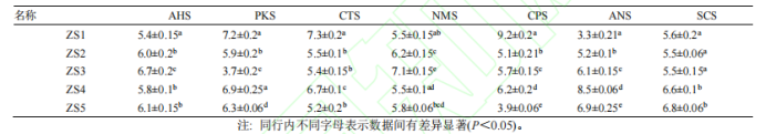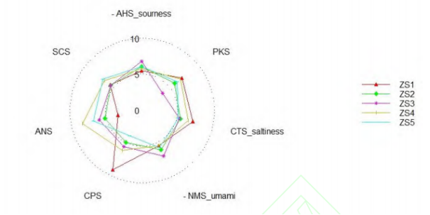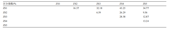 表1是5個(gè)不同品種抓飯電子舌區(qū)別指數(shù)分析,ZS2、ZS3、ZS5區(qū)別指數(shù)分別為6.59,9.56,12.87,距離值最小,可知三者味覺的相似性較大。ZS1和ZS4的距離值最大43.25,可知兩者的相似性最小。