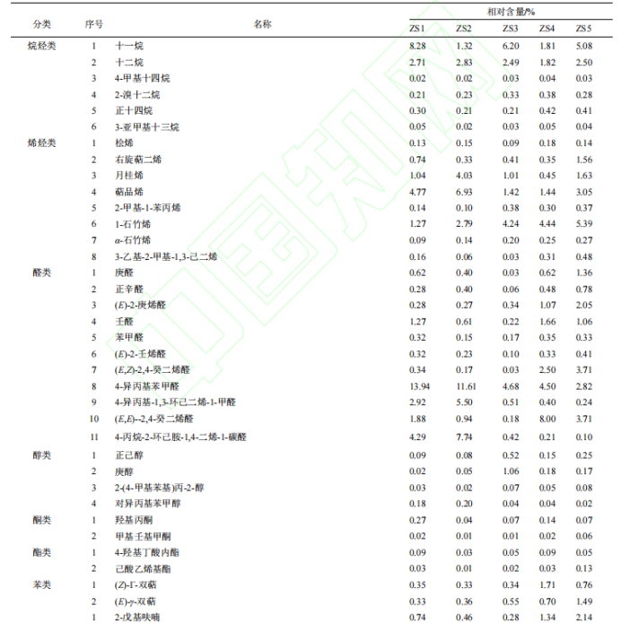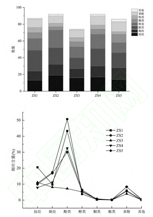 GC-MS檢測揮發(fā)性物質(zhì)種類與含量 5種市售抓飯共鑒定出132種化合物,其中包括烷烴(25種)、烯烴(16種)、醛類(27種)、醇類(26種)、酮類(11種)、酯類(9種)、苯酚類(15種)、其它(3種)。從圖4可以看出,ZS1鑒定出87種,其中醛類(43.31%)、烷烴(20.54%)相對(duì)含量較高;ZS2鑒定出92種,其中醛類(50.68%)、烯烴(17.41%)、烷烴(10.53%)相對(duì)含量較高;ZS3鑒定出74種,其中烷烴(11.11%)、烯烴(8.11%)相對(duì)含量較高;ZS4鑒定出92種,其中醛類(32.47%)、烯烴(11.12%)相對(duì)含量較高;ZS5鑒定出86種,其中醛類(30.04%)烯烴(16.85%)相對(duì)含量較高。