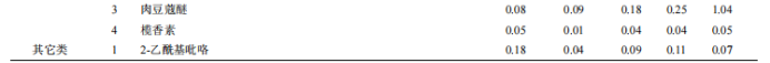 圖4 不同抓飯揮發(fā)性成分分類和相對(duì)含量統(tǒng)計(jì) 5組抓飯GC-MS分析如表4所示,共檢測出共有揮發(fā)性風(fēng)味物質(zhì)39種,主要包括:烷烴類(6種)相對(duì)平均含量7.67%,烯烴類(8種)相對(duì)平均含量10.25%、醛類(11種)相對(duì)平均含量19.58%、醇類(4種)相對(duì)平均含量0.66%、酯類(2種)相對(duì)平均含量0.1%、酮類(2種)相對(duì)平均含量0.14%、雙萜類(2種)相對(duì)平均含量1.39%、其它(4種)相對(duì)平均含量1.46%。5組抓飯共有化合物相對(duì)平均含量為41.252%。相對(duì)平均含量超過1%的化合物有10種分別為:十一烷(4.54%)、十二烷(2.47%)、月桂烯(4.54%)、萜品烯(3.52%)、1-石竹烯(3.63%)、(E,Z)-2,4-癸二烯醛(1.35%)、4-異丙基苯甲醛(7.51%)、4-異丙基-1,3-環(huán)己二烯-1-甲醛(1.91%)、反式-2,4-癸二烯醛(2.94%)、4-丙烷-2-環(huán)己胺-1,4-二烯-1-碳醛(2.55%),這10種化合物相對(duì)總含量達(dá)到34.96%,占共有化合物相對(duì)含量的84.7%。 表3 基于氣相色譜質(zhì)譜(GC-MS)鑒定抓飯共有揮發(fā)性成分