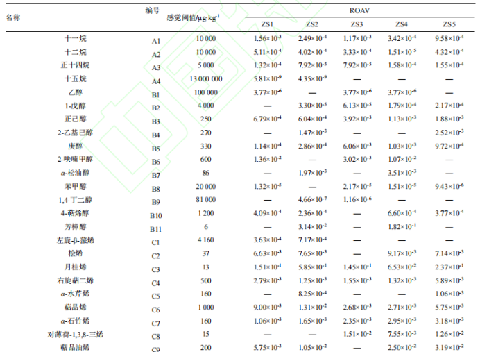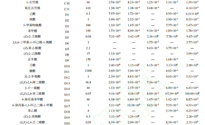 根據(jù)文獻(xiàn)查閱感覺閾值并計(jì)算抓飯香氣成分ROAV,本研究只針對(duì)能查到感覺閾值的化合物。篩選ROAV大于0.1的揮發(fā)性物質(zhì)分析,結(jié)果如表4所示,(E,Z)-2,4-癸二烯醛對(duì)抓飯香氣貢獻(xiàn)最大,定義其為ROAVmax=100,ROAV≥1的物質(zhì)對(duì)抓飯香氣貢獻(xiàn)較大,0.1≤ROAV<1的物質(zhì)對(duì)抓飯香氣有重要的修飾作用。月桂烯、1-石竹烯、己醛、庚醛、(E)-2-壬烯醛、反-2-辛烯醛、壬醛、(E,Z)-2,4-癸二烯醛、4-異丙基苯甲醛、4-異丙基-1,3-環(huán)己二烯-1-甲醛、苯乙醛、(E)-2-癸烯醛、(E,E)-2,4-壬二烯醛、(E,E)-2,4-癸二烯醛、(E)-2-庚烯醛、α-紫羅酮、β-紫羅酮、2-正戊基呋喃18種化合物ROAV大于0.1,為抓飯香氣主要香氣成分。其中(E,Z)-2,4-癸二烯醛、(E,E)-2,4-癸二烯醛、4-異丙基-1,3-環(huán)己二烯-1-甲醛、(E)-2-癸烯醛、壬醛、(E)-2-壬烯醛、β-紫羅酮7種化合物ROAV大于1,為抓飯關(guān)鍵香氣成分,其余11種化合物對(duì)抓飯香氣具有重要修飾作用。 表4 抓飯揮發(fā)性風(fēng)味物質(zhì)的香氣閾值及ROAV