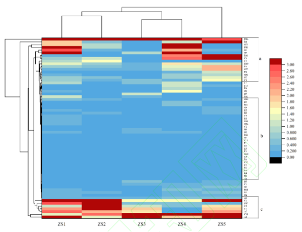 圖5 抓飯揮發(fā)性成分PCA雙標(biāo)圖 圖6為抓飯主要揮發(fā)性化合物聚類熱圖。通過顏色變化可直觀看出各抓飯揮發(fā)性風(fēng)味組分間存在差異;通過化合物聚類結(jié)果可知,化合物相對(duì)含量相似組分大多聚為一類,顏色變化趨勢基本一致;從上方的聚類來看,所有的樣品大致可以分為3類:主要體現(xiàn)在a、b、c3個(gè)區(qū)域內(nèi)揮發(fā)性化合物相對(duì)含量的變化;聚類熱圖在主成分分析和相關(guān)性分析上均有較高的響應(yīng)。