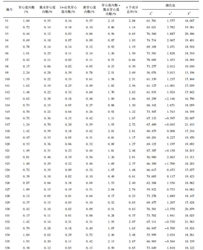 表4 穿心蓮粉末色度值與4個二萜內酯類成分含量的相關性分析