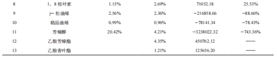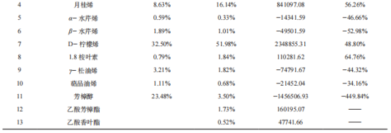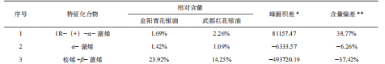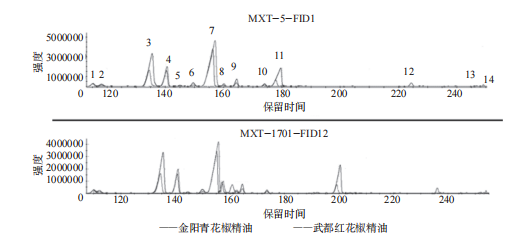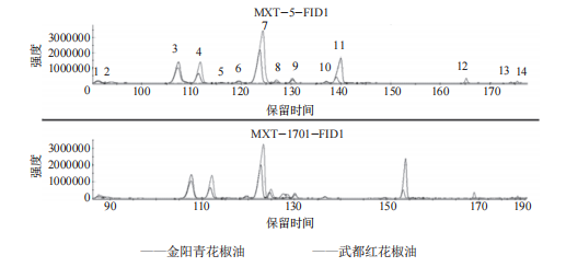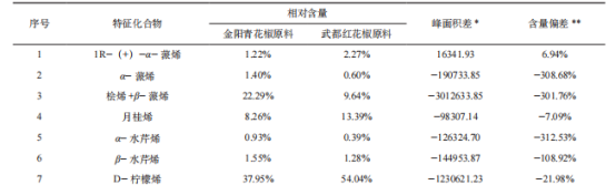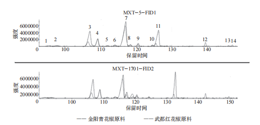 花椒作物在我國很多地區(qū)都有種植,花椒的揮發(fā)油是花椒香氣的主要來源,也是反映花椒香氣的主要指標(biāo),花椒中揮發(fā)油的含量及組成成分不僅受到花椒品種、產(chǎn)地環(huán)境因子(如產(chǎn)地氣候、雨量、日照時間、土質(zhì)等)的影響,還受到提取加工方法、提取部位和采收時期等外在因素的影響。 超快速氣相電子鼻技術(shù)具有分析速度快、靈敏度高和檢測費用低等優(yōu)點。超快速氣相電子鼻將雙快速氣相色譜檢測與基于多變量統(tǒng)計的強大數(shù)據(jù)處理和感官及化學(xué)表征(Arochembase)的可選模塊相結(jié)合,利用超快速氣相電子鼻技術(shù),解析不同品種花椒及花椒提取物揮發(fā)性化合物,通過主成分分析建立產(chǎn)品有效判別模型,同時解析花椒物質(zhì)構(gòu)成。 不同產(chǎn)地花椒原料、花椒精油產(chǎn)品、花椒油產(chǎn)品、nC6-nC16標(biāo)準(zhǔn)溶液。 超快速氣相電子鼻;零空氣發(fā)生器;氫氣發(fā)生器;20mL頂空進樣瓶,電子天平。 花椒:取0.2g花椒顆粒于20mL頂空進樣瓶中,迅速加蓋密封檢測,設(shè)置3個平行樣品,降低檢測誤差。 花椒精油:將花椒精油搖晃均勻后,取20uL于20mL頂空進樣瓶中,加蓋密封檢測,每個樣品設(shè)置3個平行樣。 花椒油:將花椒油搖晃均勻后,使用電子天平稱取0.1g于20mL頂空進樣瓶中,加蓋密封檢測,設(shè)置3個平行樣品。 花椒原料:樣品量0.2g,進樣體積500uL,孵化溫度80℃,孵化時間20min,50℃恒溫30s,1℃/s速率升溫至80℃恒溫30s,3℃/s速率升溫至125℃恒溫10s,3℃/s速率升溫至250℃恒溫11s。 花椒精油:取樣量100μL,捕集溫度40℃,孵化溫度60℃,孵化時間10min,載氣流量30mL/min;進樣量1000uL,進樣口溫度200℃,閥溫度為250℃;FID溫度260℃,升溫程序:初始溫度45℃,保持35s,1.0℃/s升至70℃,保持30s,0.5℃/s升至140℃,3.0℃/s升至250℃,保持21s,采集時間共計288s。花椒油:取樣量0.1g,捕集溫度40℃,孵化溫度60℃,孵化時間20min,載氣流量30mL/min;進樣量500uL,進樣口溫度200℃,閥溫度為260℃,F(xiàn)ID溫度為260℃,升溫程序:初始溫度50℃,保持30s,1.0℃/s升至85℃,保持30s,1.0℃/s升至125℃,保持10s,3.0℃/s升至250℃,保持10s,采集時間共計197s。 將裝有樣品的頂空小瓶按照順序依次放入樣品盤,每3個平行樣品后面放入一個空瓶,目的是為了消除樣品帶來的信號干擾,選擇程序進行樣品分析。 使用Heracles超快速氣相電子鼻自帶軟件Alphasoft進行樣品數(shù)據(jù)處理,明確揮發(fā)性風(fēng)味物質(zhì)種類與含量。 利用正構(gòu)烷烴標(biāo)準(zhǔn)溶液(nC6-nC16)進行校準(zhǔn),進行保留時間與保留參數(shù)之間的轉(zhuǎn)換,利用超快速氣相電子鼻自帶數(shù)據(jù)庫AroChembase數(shù)據(jù)庫對樣品中的成分進行定性分析,采用峰面積歸一法對目標(biāo)化合物進行定量分析,確定各香氣成分相對含量。 采用正構(gòu)烷烴標(biāo)準(zhǔn)溶液(nC6-nC16)對檢測方法進行校準(zhǔn),結(jié)合超快速氣相電子鼻自帶AroChembase數(shù)據(jù)庫對樣品中主要揮發(fā)性成分進行定性分析,推測得到匹配度高的化合物。 通過對比色譜圖(圖1)發(fā)現(xiàn),樣品間的出峰時間及出峰位置基本一致,峰面積間存在差異,說明樣品中揮發(fā)性成分的種類基本一致,含量上存在略微差異。 青花椒原料中共分析出11種含量較高成分,紅花椒原料中共分析出13種含量較高成分,乙酸芳樟酯與乙酸香葉酯在青花椒中未曾檢測出。通過計算,可知青、紅花椒不僅成分種類上有差異,各成分含量上同樣差異明顯。除1R-(+)-α-蒎烯、1,8桉葉素、乙酸芳樟酯、乙酸香葉酯外,其他成分均是青花椒中含量較紅花椒高。其中,青紅花椒原料中芳樟醇含量差別最大,差異最為明顯,D-檸檬烯含量差別較大,但相對偏差不大,推斷不是造成青紅花椒風(fēng)味不同的主要差異。乙酸芳樟酯、乙酸香葉酯僅存在于紅花椒原料中,由此可利用花椒原料產(chǎn)品中芳樟醇、乙酸芳樟酯、乙酸香葉酯含量區(qū)分花椒原料種類。 表1 武都紅花椒、金陽青花椒原料特征化合物相對含量與峰面積差異 青花椒精油中共分析出11種含量較高成分,紅花椒精油中共分析出13種含量較高成分,乙酸芳樟酯與乙酸香葉酯在青花椒中未曾檢測出,與原料表現(xiàn)一致。通過計算峰面積差值和含量偏差可知,乙酸芳樟酯等酯類物質(zhì)僅存在于紅花椒中。1R-(+)-α-蒎烯、月桂烯、D-檸檬烯、1,8桉葉素在紅花椒精油中含量較高,其他組分在青花椒精油中含量較高,和原料情況不一致,可能和提取工藝有關(guān)。其中芳樟醇含量差別最大,差異最為明顯,乙酸芳樟酯、乙酸香葉酯僅存在于紅花椒精油產(chǎn)品中,由此可利用花椒精油產(chǎn)品中檜烯、β-蒎烯、芳樟醇含量和乙酸芳樟酯、乙酸香葉酯等酯類物質(zhì)存在與否來區(qū)分花椒精油種類。 表2 武都紅花椒精油、金陽青花椒精油特征化合物相對含量與峰面積差異