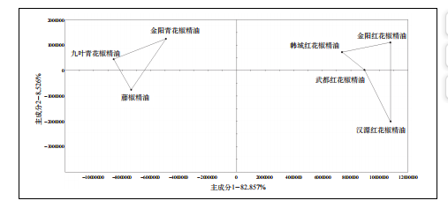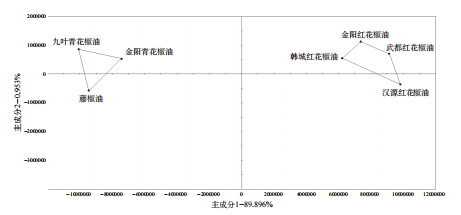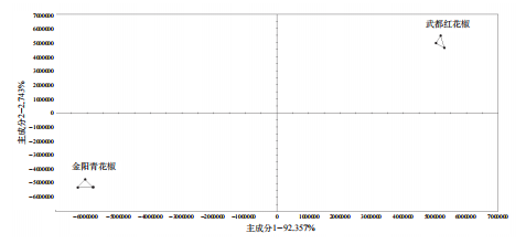 青花椒油中共分析出11種含量較高成分,紅花椒油中共分析出13種含量較高成分,乙酸芳樟酯與乙酸香葉酯在青花椒油中未曾檢測出。 通過計算峰面積差值和含量偏差可知,乙酸芳樟酯等酯類物質(zhì)僅存在于紅花椒油中,與精油情況一致,青紅花椒油中芳樟醇含量差別最大,差異最為明顯,乙酸芳樟酯僅存在于紅花椒原料中,由此可利用花椒精油產(chǎn)品中檜烯、β-蒎烯、芳樟醇含量和乙酸芳樟酯、乙酸香葉酯等酯類物質(zhì)存在與否來區(qū)分花椒精油種類。對青紅花椒原料及花椒提取物進行指紋圖譜與物質(zhì)定性分析,青紅花椒在成分種類上有差異,紅花椒成分較青花椒復(fù)雜,主要體現(xiàn)在乙酸芳樟酯、乙酸香葉酯等酯類和醛類物質(zhì)上;青紅花椒各成分相對含量上差異明顯,其中芳樟醇、檜烯差異最為明顯,D-檸檬烯含量差別大,但差異貢獻度不大;芳樟醇、乙酸芳樟酯等成分可用來鑒別青紅花椒產(chǎn)品類別,且電子鼻分析速度快,可大大節(jié)約成本。 表3 武都紅花椒油、金陽青花椒油特征化合物相對含量與峰面積差異 主成分分析(PCA)是一種常見的多元統(tǒng)計方法,主要通過將采集的多指標(biāo)進行數(shù)據(jù)轉(zhuǎn)換與降維,使用線性分類處理降維的特征向量,盡可能捕集數(shù)據(jù)集間最大差異,從整體層面上直觀地展示樣品分布。對花椒原料、花椒精油、花椒油進行主成分分析,由圖4原料主成分分析可以看出,兩種花椒原料之間存在顯著差異,現(xiàn)有數(shù)據(jù)可對未知產(chǎn)地的原料進行產(chǎn)地區(qū)分,前提是原料來自兩個產(chǎn)地。后續(xù)可收集其余產(chǎn)地花椒原料,積累大量數(shù)據(jù),建立原料質(zhì)量標(biāo)準(zhǔn),對實際應(yīng)用中采購、生產(chǎn)、銷售提供指導(dǎo)性建議。 對6類花椒精油樣品進行PCA分析,結(jié)果如圖5所示,PC1與PC2相加大于91.38%,代表被檢測樣品中絕大部分信息,說明實驗的花椒精油樣品成分存在差異,呈現(xiàn)不同類型風(fēng)味,主成分分析能對不同種類花椒精油進行識別與區(qū)分。 對四類花椒油樣品進行PCA分析,結(jié)果如圖6所示,PC1方差貢獻率為89.896%,PC2的方差貢獻率為0.953%,兩者累計方差為90.849%,主成分顯示樣品中絕大部分信息,說明實驗的花椒油樣品成分存在差異,呈現(xiàn)不同類型風(fēng)味,主成分分析能對不同種類花椒油進行識別與區(qū)分。 利用超快速氣相電子鼻技術(shù),解析不同產(chǎn)地花椒及花椒提取物指紋圖譜,明確花椒及花椒提取物揮發(fā)性風(fēng)味物質(zhì),芳樟醇、乙酸芳樟酯等成分可用來鑒別青紅花椒產(chǎn)品類別,且電子鼻分析速度快,可大大節(jié)約成本,利用超快速氣相電子鼻技術(shù)可識別花椒中的關(guān)鍵香氣成分,為花椒品種篩選、產(chǎn)地識別和深加工提供理論依據(jù)。