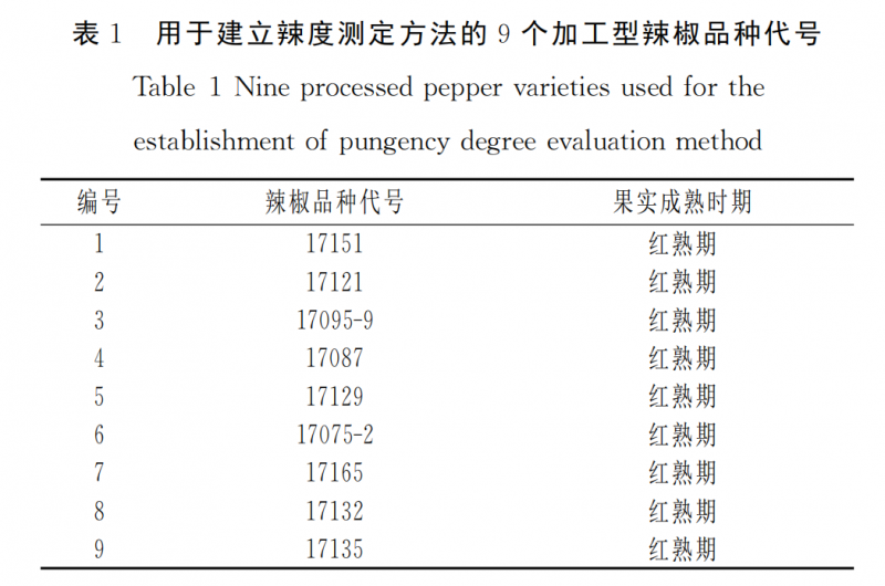 辣椒,其果實(shí)既可以作為鮮食蔬菜,供人們直接食用,也可制成不同風(fēng)味的辣椒醬作為佐餐的調(diào)味佳品,此外,其還是 生 物 堿、天然色素和制藥的重要工業(yè)原料。我國辣椒栽培面積占世界辣椒的35%,總栽培面積已超過1000 萬公頃。我國辣椒經(jīng)濟(jì)產(chǎn)值和效益居各類蔬菜之首,栽植遍布全國各地,形成的品種類型間差異巨大,滿足了不同需求。對辣椒產(chǎn)品加工而言,原材料的質(zhì)量穩(wěn)定和標(biāo)準(zhǔn)化是必要的前提,其中穩(wěn)定辣度篩選是評價(jià)辣椒品質(zhì)的重要指標(biāo)。企業(yè)在收購和使用前,必須對辣椒果實(shí)的辣度進(jìn)行檢測,以確保各批產(chǎn)品的辣味穩(wěn)定。因原料數(shù)量巨大、儲(chǔ)運(yùn)加工過程等環(huán)節(jié)的技術(shù)要求,需要建立快速準(zhǔn)確的辣度檢測方法。