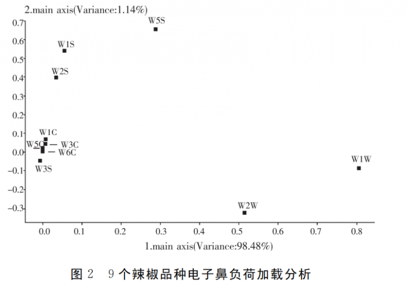 負(fù)荷加載分析(Loadings)與 PCA 分析是相關(guān)的,基于同一種算法,區(qū)別在于 Loadings分析是針對電子鼻傳感器貢獻(xiàn)率進(jìn)行研究。電子鼻共有10個(gè)傳感器,不同傳感器可以反映樣品中揮發(fā)性氣味的響應(yīng)值,傳感器數(shù)值離原點(diǎn)越遠(yuǎn),說明該傳感器識(shí)別能力越強(qiáng),反之則越弱。由圖2可知,在第一主成分中,W1W 傳感器識(shí)別作用最強(qiáng),其次是 W2W 傳感器,這2個(gè)傳感器與其余傳感器相比,距原點(diǎn)的距離明顯較遠(yuǎn),識(shí)別能力強(qiáng)。在第二主成分中,W5S傳感器距原點(diǎn)距離明顯遠(yuǎn)于其余傳感器,綜合來看,W5S、W1W、W2W 傳感 器對9 種辣椒品種的辣度評價(jià)起到了主要作用,這與圖1中的辣度均值分析結(jié)果相吻合。