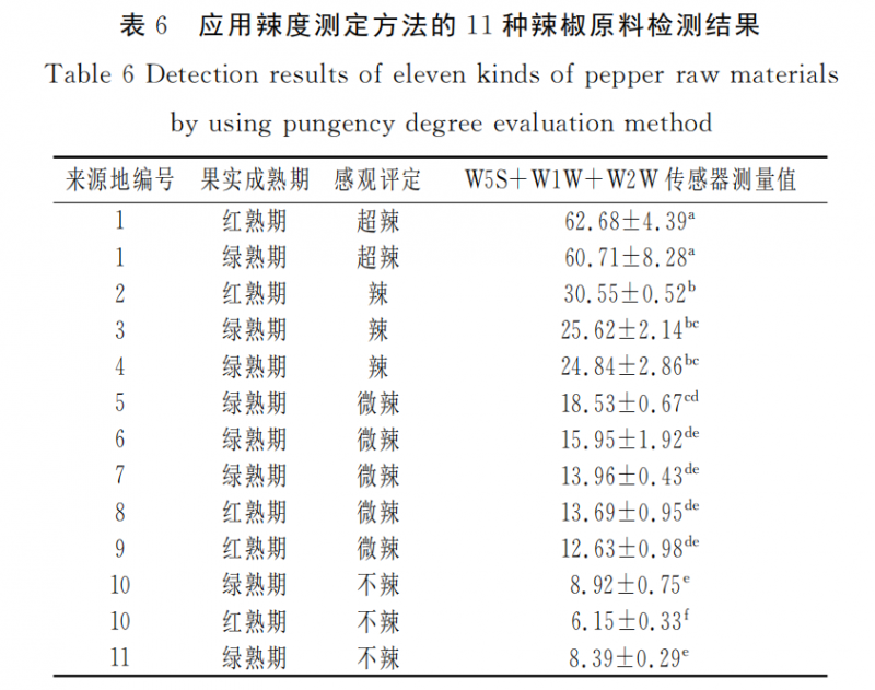 由表6可知,11種辣椒原料存在顯著性差異,說明利用電子鼻可以有效區(qū)分辣椒品種。且所有紅熟期辣椒、所有綠熟期辣椒和同一品種紅綠果辣椒辣度測定結(jié)果均與上述結(jié)果吻合:感官評價(jià)為不辣的辣椒原料,其 W5S、W1W、W2W 數(shù)值之和在1~10之 間;感官評價(jià)為微辣的辣椒原料,其 W5S、W1W、W2W 傳感器辣度值之和在10.1~20之間;感官評價(jià)為辣的辣椒原料,其 W5S、W1W、W2W 傳感器辣度值之和在20.1~50,其中,魔鬼椒的 W5S、W1W、W2W 傳感器辣度值之和大于50.1,評定為超辣,證明電子鼻測定辣椒辣度的可行性。