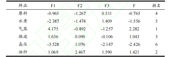 通過計(jì)算得到不同烹飪方式的芫根的綜合品質(zhì)得分,得分高低反映芫根品質(zhì)的高低,如表5所示,PC1中得分最高的是氣蒸芫根和油炒芫根,說明PC1對(duì)這兩種方式烹飪的芫根品質(zhì)有較大影響;PC2中微波的芫根得分最高,說明ABTS抗氧化能力對(duì)其品質(zhì)影響最大;PC3中新鮮芫根得分最高。根據(jù)綜合評(píng)分排名情況來看,不同烹飪方式處理后的芫根品質(zhì)存在較大差異,氣蒸芫根綜合得分最高,其次是油炒芫根,高壓芫根得分最低。