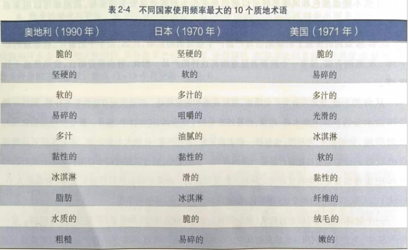 一定的質(zhì)地術(shù)語和感覺可以跨越文化的差異,具有國際性。因此,任何國家、文化或地區(qū)的感官專家應(yīng)當不僅僅注意食品可感知到的風味、味道和顏色的量值,而且要注意能感知到的質(zhì)地特征。有研究表明:不同國家的質(zhì)地描述詞匯大多數(shù)是相同的,如表2-4所示。