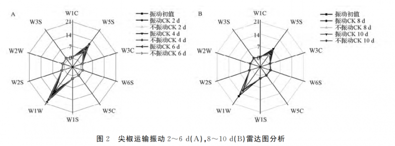 圖10(A)為西蘭花前3d的雷達圖(B 組),前3d西蘭花的氣味變化并不明顯,均接近初值,說明此時的西蘭花新鮮,具有商品價值。4d西蘭花的氣味與 初 值 相 比 明 顯 改 變,2號 和7號 傳感器的響應值變化明顯,此時西蘭花腐爛變質,出現其它氣味,失去商品價值。不振動 CK 組的氣味明顯好于振動 CK 組,說明振動影響西蘭花組織表皮細胞的滲透和細胞壁的降解,并影響運輸后西蘭花的硬度和外部變化,降低商品價值。