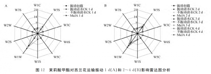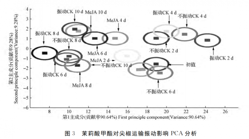 對振動組和 MeJA 處理組的尖椒、青 圓 椒 和西蘭花進行檢測,分析運輸振動對蔬菜變化與電子鼻無損檢測間的關系,利用對傳感器響應值進行PCA 方法的分析,實現了蔬菜運輸振動后的新鮮度鑒別。當采用 PCA 方 法分 析 時,電 子 鼻 可以區分處理組與對照組的蔬菜,并且可以區分不同貯藏時間的尖椒和西蘭花。采用雷達圖分析方法可得出,傳感器 W5S、W1W 在檢測中作用最大,對區分蔬菜是否新鮮,是否有商品價值貢獻最大。不振動組的尖椒和西蘭花的氣味改變較小,青圓椒的不振動組和振動組的氣味變化不大,所以減小運輸過程中果蔬的振動可以有效提高果蔬的商品價值。MeJA 可通過激活植物的防御反應和修復外來機械損傷來調控果蔬的品質,用MeJA 處理振動 后 的 尖 椒、青圓椒和西蘭花可以有效抑制尖椒、青圓椒和西蘭花氣味的改變。