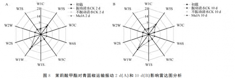 茉莉酸甲酯對尖椒運輸振動影響雷達圖分析
