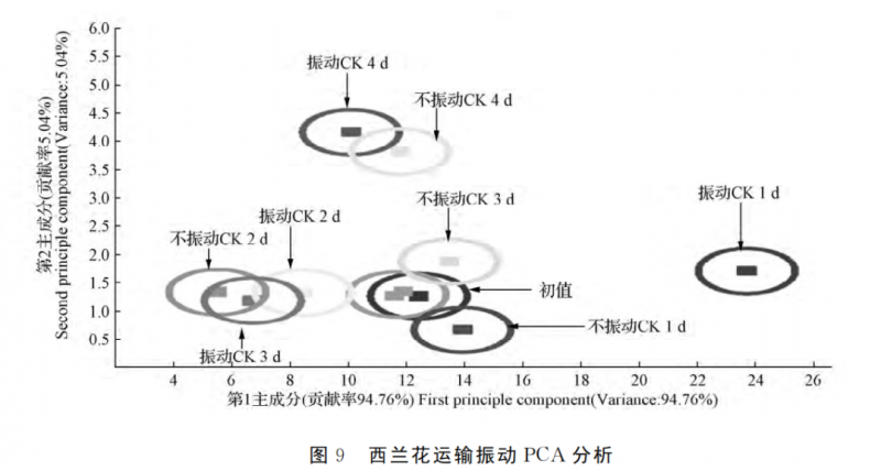 如圖9所示,振動 CK 組和不振動 CK 組(A組)的西蘭花主成分1的貢獻率為94.76%,主成分2 的貢獻率為 5.04%,總貢獻率為 99.80%。表明2個主成分已經基本代表了樣品的主要信息特征,電子鼻能夠對樣品和貯藏時間加以區分。前3d,振動 CK 組和不振動 CK 組的揮發性物質成分區域接近初值,4d均遠離初值,西蘭花的揮發性物質在4d發 生 改 變,此時西蘭花的新鮮度降低,失去商品價值。在相同貯藏時間下,不振動CK 組比振動 CK 組揮發性物質成分區域更接近初值,說明在相同貯藏天數下,西蘭花經過振動后,氣味更容易發生改變。運輸過程中更容易使西蘭花發生損傷,如擦傷、淤傷和擦傷帶有淤傷,這些擦傷會減少西蘭花貯藏時間,使西蘭花更易腐敗。