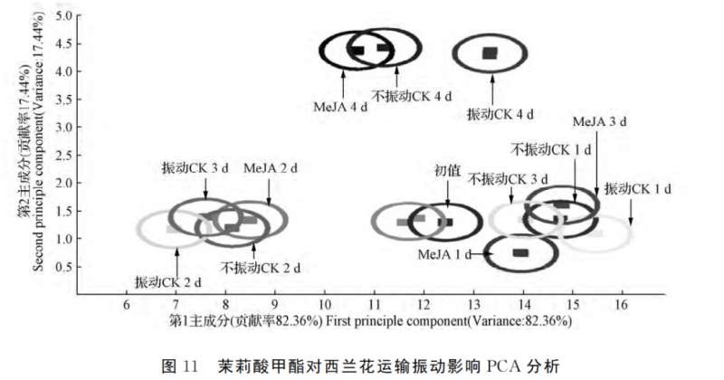如圖11所示,清水CK 組和振動 MeJA 組(B組)的西蘭花主成分1的貢獻率為82.36%,主成分2的貢獻率為17.44%,總貢獻率 為99.80%。表明2個主成分已經基本代表了樣品的主要信息特征,電子鼻能夠對樣品和貯藏時間加以區分。如圖11所示,2d后振動清水 CK 組、不振動清水CK 組和振動 MeJA 組的揮發性物質成分區域遠離初值,說明經過清水浸泡的西蘭花,比未經過清水浸泡的西蘭花更容易腐敗,貯藏2d氣味就改變較為明顯。在相同貯藏時間下,經過 MeJA 處理的西蘭花揮發性物質成分區域距離初值較為接近,說明,運輸振動后的西蘭花,經過 MeJA 浸泡可以有效減弱西蘭花氣味的改變,提高商品價值和貯藏品質。貯 藏4d后,西蘭花氣味改變較為明顯,此時西蘭花完全失去商品價值。