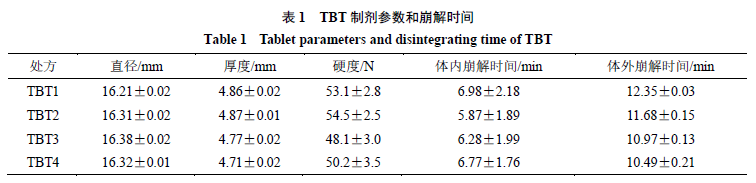 含片硬度、崩解時(shí)間的測(cè)定 采用游標(biāo)卡尺測(cè)定TBT的厚度和直徑,片劑測(cè)試儀測(cè)量片劑的硬度。崩解時(shí)間的測(cè)定選取12名健康志愿者(20~30歲,來(lái)自成都中醫(yī)藥大學(xué))評(píng)價(jià)。將片劑含于口腔內(nèi),直到片劑崩解完全,記錄時(shí)間,得到其體內(nèi)崩解時(shí)間;將900 mL水加熱維持在(37.0±0.5)℃,作為崩解介質(zhì),采用崩解儀測(cè)定含片的體外崩解時(shí)間。TBT的基本制劑質(zhì)量參數(shù)見表1。掩味后2種含片的外觀直徑略大于原片,厚度變小,可能是由于硬度變小所導(dǎo)致。4種含片的體內(nèi)崩解時(shí)間與體外崩解時(shí)間差異較大,可能是由于人體測(cè)試過(guò)程中會(huì)不自主的摩擦攪拌含片,故崩解時(shí)間縮短。4種TBT的體外崩解時(shí)間均能滿足口含片不在10 min內(nèi)全部崩解或溶化的要求。