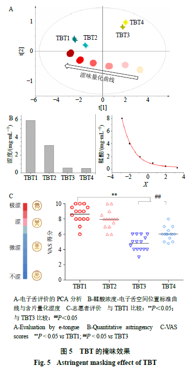 (2)感官分析驗(yàn)證:采用視覺模擬量表法(visual analogue scale,VAS)進(jìn)行評(píng)估。感官評(píng)價(jià)小組由來(lái)自成都中醫(yī)藥大學(xué)的健康志愿者(20~26歲,味覺正常,無(wú)抽煙、酗酒史)構(gòu)成,實(shí)驗(yàn)經(jīng)過(guò)成都中醫(yī)藥大學(xué)附屬醫(yī)院倫理委員會(huì)(批準(zhǔn)編號(hào):2014KL016)審核批準(zhǔn)。首先,采用酸(檸檬酸)、苦(奎寧)、甜(蔗糖)、咸(氯化鈉)、鮮(谷氨酸鈉)、澀(鞣酸)6種味覺溶液測(cè)試志愿者的味覺靈敏度;再用鞣酸溶液(0.062 5、0.125、0.25、0.5、1、2、4、8 mg/mL)訓(xùn)練志愿者對(duì)澀味強(qiáng)度的認(rèn)知,熟悉評(píng)價(jià)標(biāo)準(zhǔn)。最終,15名志愿者(5名男性和10名女性)參加TBT的澀味評(píng)估。志愿者將口含片置于口腔內(nèi),含服至無(wú)顆粒感,根據(jù)量表的標(biāo)尺評(píng)分。樣品測(cè)試間隔,用純水沖洗口腔至無(wú)澀味感,并給予一定時(shí)間休息。