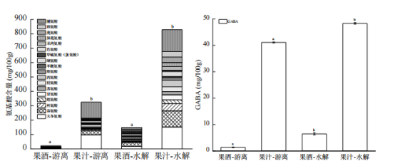 03 百香果果汁和果酒中的氨基酸分析果汁酒和原果汁中均檢測到18種游離氨基酸,與百香果果汁相比,百香果果酒的甜味氨基酸(Thr、Gly、Ala、Pro、Ser)的占比增加了5.90%,苦味氨基酸(His、Met、Arg、Val、Leu、Ile、Tyr、Phe)含量也顯著下降。經完全水解后,兩個樣品中的氨基酸含量都有所增加。