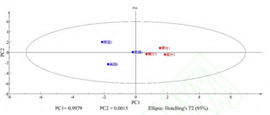 由PCA分析圖可知,第一主成分的方差貢獻率為99.79%,第二主成分的方差貢獻率為0.15%,兩者的總貢獻率為99.94%,表明此結果能較好反應樣品間的風味差異。兩者風味差異較大,整體區(qū)分度較好,PCA方法適用于百香果果酒發(fā)酵前后揮發(fā)性成分分析。由于PC1貢獻率遠遠大于PC2,因此樣品差異主要體現(xiàn)在PC1軸方向每個樣本簇之間的距離。果汁和果酒樣品組則分別處于PC1正負半軸上,說明酵母發(fā)酵對百香果風味有較大影響,與百香果果汁差異較大。因此,說明百香果果酒感官特征變化顯著,可以采用電子鼻技術對原果汁和果汁酒進行區(qū)分。