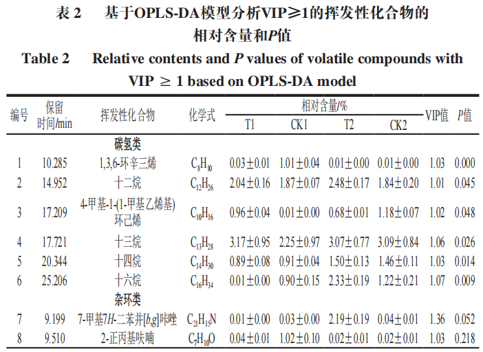 如圖6所示,模型累積解釋率R2x為0.999 1,整體預測能力Q2為-0.704 0,置換檢驗200 次的模型R2=0.999 1,Q2=-0.862 5,并且Q2回歸曲線與Y軸的截距小于0,表明模型不存在過度擬合現象,結果較為可靠。在OPLS-DA中,茶樣之間距離越小則差異越小,反之則意味著差異較大。CK2、T2、CK1和T1分別置于4 個象限,表明杜仲嫩葉茶和成熟葉茶揮發性化合物組成在蒸汽爆破處理后均發生了顯著變化,同時,嫩葉茶和成熟葉茶之間的揮發性化合物組成存在顯著差異。整體上,4 種處理的揮發性化合物組成均能被有效區分開。