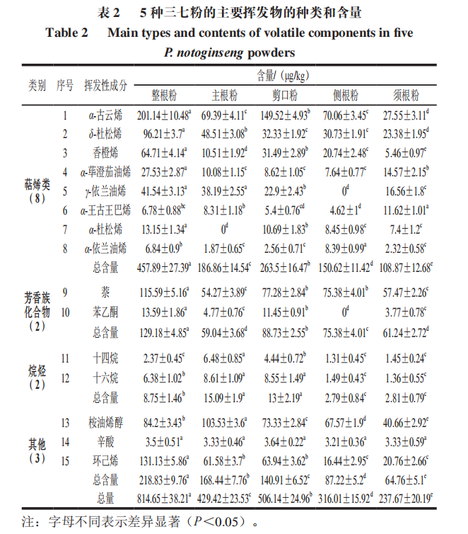 經(jīng)GC-MS 聯(lián)用技術(shù)檢測發(fā)現(xiàn),5 種不同部位三七粉揮發(fā)物共有31 種,包括萜烯類17 種,占比43.51%~56.21%;芳香族化合物2 種,占比13.75%~25.77%;烷烴類8 種,占比1.06%~3.51%;烯烴、酸類和醇類4 種,占比26.86%~39.23%。采用Duncan法進行多重比較,主要的代表性揮發(fā)物見表2。