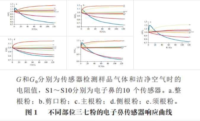 三七,又名文州三七,為五加科人參屬植物,是臨床常用傳統(tǒng)中藥。三七商品有主根、剪口、側(cè)根、須根的劃分,不同部位的藥用成分構(gòu)成有較大差異,臨床功效也不盡相同。三七的主要商業(yè)價值在于剪口和主根,三七粉是三七的主要消費和商品形式。但剪口、主根、側(cè)根和須根等在粉末狀態(tài)下顏色相同,通過肉眼很難對其進行鑒別。已有研究表明,三七揮發(fā)性成分眾多,且三七不同部位揮發(fā)物有差異。因此,可以通過三七粉揮發(fā)物的檢測對不同部位三七粉進行鑒別。