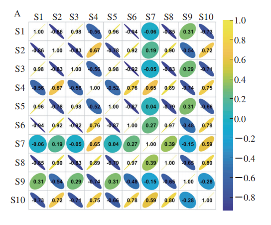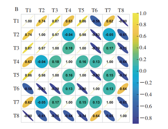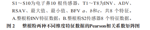 特征變量之間存在高沖突數(shù)據(jù)會影響特征融合數(shù)據(jù)的可靠性,繼而會影響分類模型建模結(jié)果,而Pearson相關(guān)系數(shù)在度量數(shù)據(jù)之間的沖突程度上表現(xiàn)良好。以整根粉10 根傳感器響應(yīng)值的INV特征數(shù)據(jù)和整根粉單個傳感器S2響應(yīng)值的8 個特征數(shù)據(jù)為例分析特征數(shù)據(jù)之間的冗余程度。圖2是這兩種不同維度數(shù)據(jù)各自的Pearson相關(guān)矩陣,其中相關(guān)系數(shù)的絕對值越接近1,說明二者之間的相關(guān)性越大;相關(guān)系數(shù)的大小在圖中用橢圓形球的寬窄和顏色表示,正負用橢圓形球的左偏和右偏表示。由圖2A可知,除S7、S9傳感器外,其余8 個傳感器之間都存在大量冗余信息;由圖2B可知,除了最大值特征T4和BFV b特征T7外,其余6 個特征數(shù)據(jù)之間存在大量冗余信息。所以,需要對特征數(shù)據(jù)進行特征降維提高分類模型的精度。