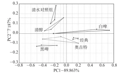啤酒鴨電子鼻檢測(cè)結(jié)果主成分分析如圖2。主成分1和主成分2的貢獻(xiàn)率分別為89.86%和7.19%,累計(jì)97.05%,幾乎涵蓋所有原始信息,同時(shí)能很好的區(qū)分開(kāi)各組啤酒鴨。白啤組位于第一象限,黑啤組位于第四象限,均與其他組距離較遠(yuǎn),說(shuō)明風(fēng)味差異較大。三種黃啤中奧古特和經(jīng)典組距離較近,但清醇組與之較遠(yuǎn),說(shuō)明同一類(lèi)型啤酒制作的啤酒鴨,風(fēng)味也會(huì)存在較大差異。