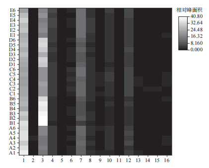 通過電子鼻對(duì)不同地區(qū)生乳進(jìn)行檢測(cè),生乳氣味指紋圖譜,如圖1所示。對(duì)各地區(qū)指紋圖譜進(jìn)行對(duì)比分析后,發(fā)現(xiàn)生乳氣味指紋圖譜中共檢出16個(gè)共有峰,不同地區(qū)生乳樣品峰的數(shù)量幾乎沒有差異,,結(jié)合16個(gè)特征峰相對(duì)峰面積熱圖(圖2)分析,不同地區(qū)生乳特征峰基本相同,但特征峰含量有明顯區(qū)別。
